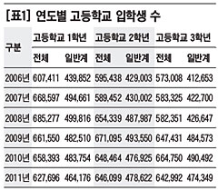 올해 고등학교 3학년 숫자가 10% 이상 급격히 증가한 반면 대학 입학정원은 큰 차이가 없다. 일반계고 3학년 숫자가 42만6000명이었던 지난해에 비해서 5만800명이 늘어난 48만4000명이 된다. 따라서 올해 입시에서는 경쟁률이 상당히 높을 것으로 보인다.<표1 참조>