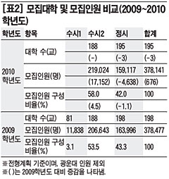 지난해까지 실시했던 수시 1학기 모집은 2010학년도부터 폐지되고, 수시는 2학기에만 모집을 한다. 수시 모집인원은 지난해 21만4481명(56.7%)보다 4543명이 늘어난 21만9024명(58%)를 선발한다.<표2 참조>